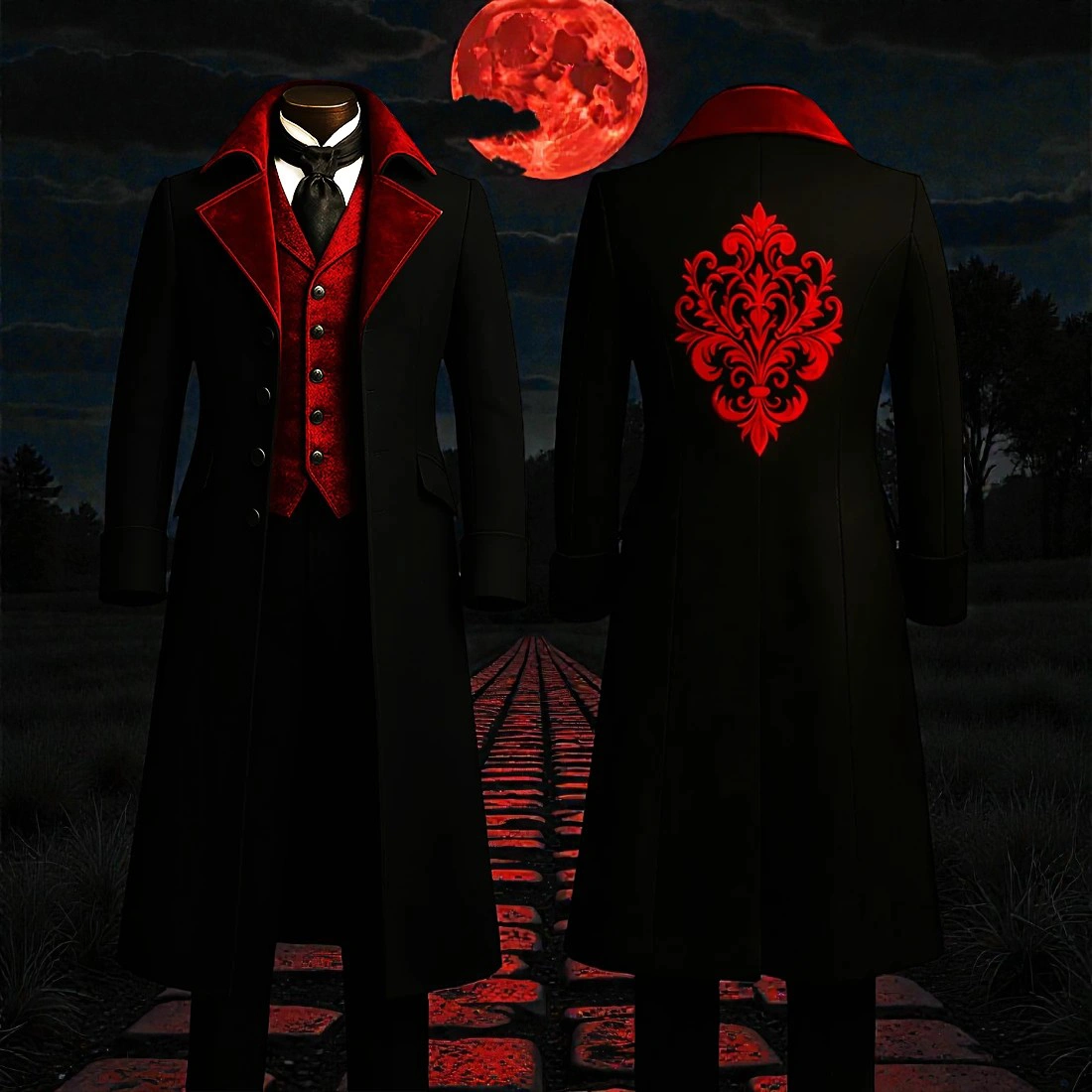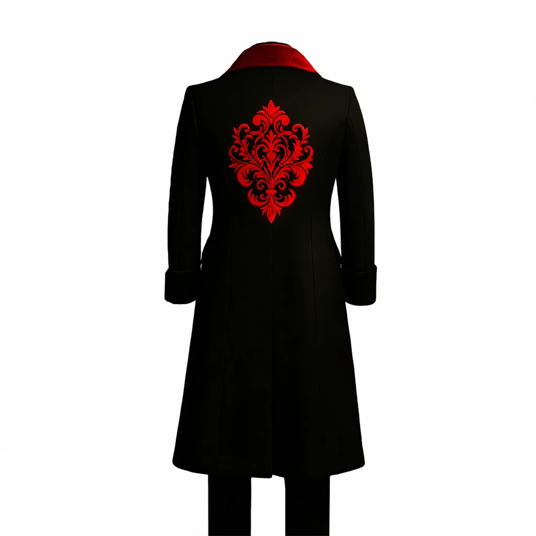 The defining feature of this ensemble is the exquisite red embroidery on the reverse, featuring an intricate damask-style flourish that radiates from the center back. This ornate scrollwork serves as a symbol of nobility and dark elegance, ensuring that whether you are portraying a high-ranking vampire lord or attending a Victorian-themed gala, your presence is felt from every angle.