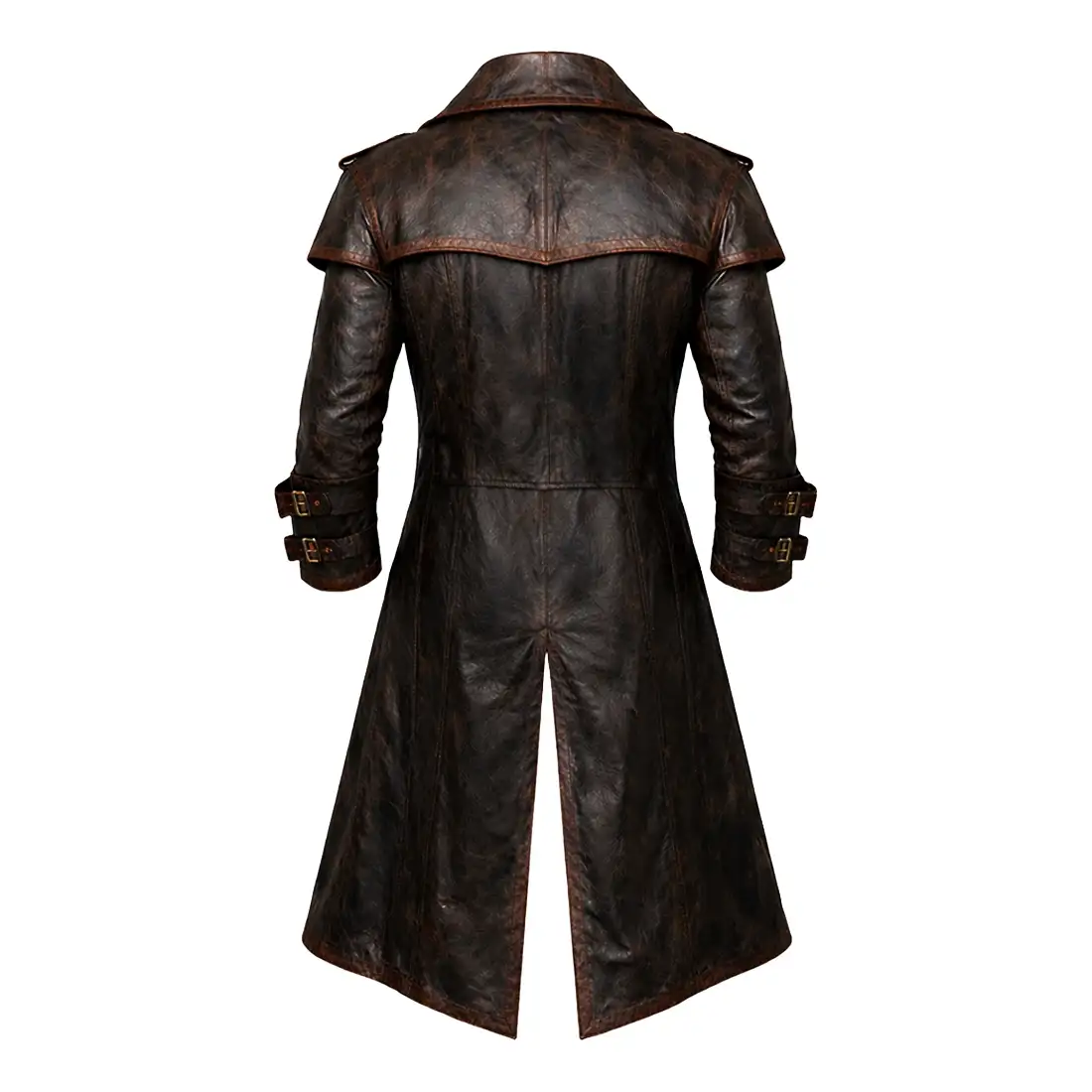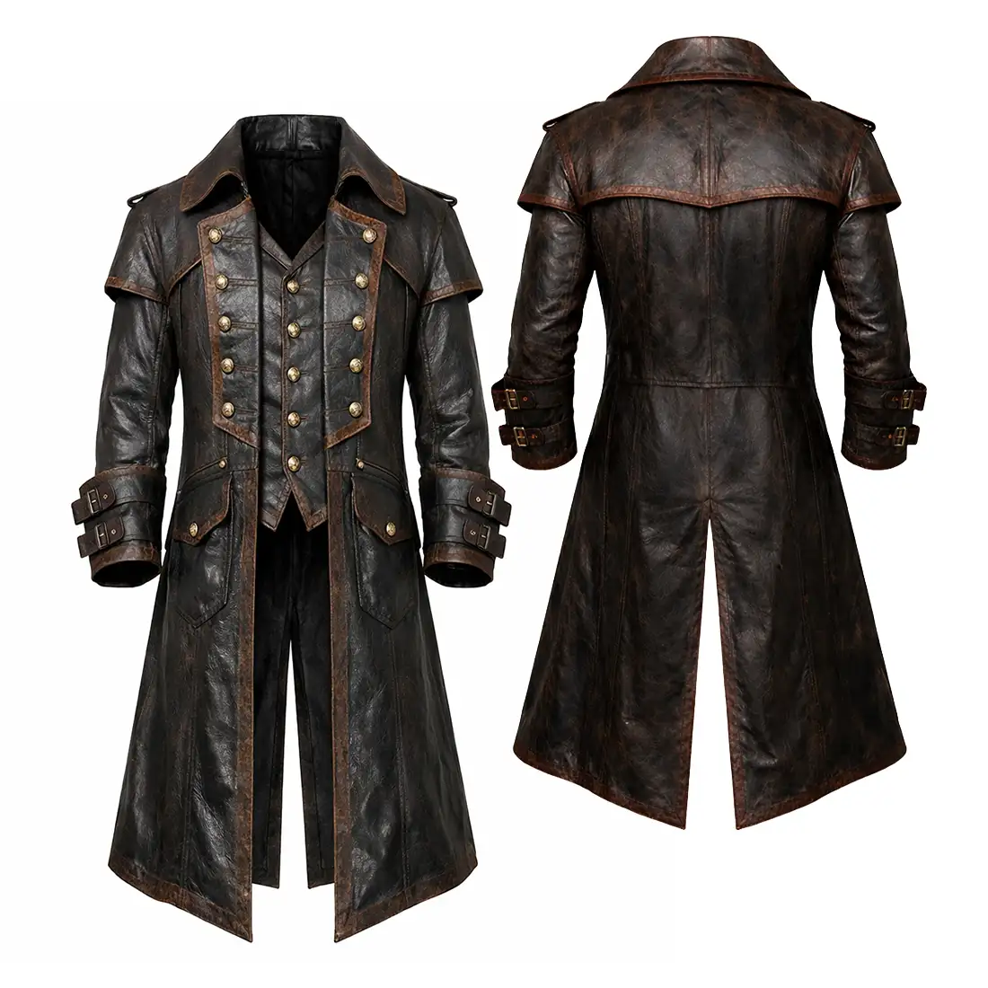 Command the quarterdeck and survive the harshest high-seas skirmishes in our Distressed Brown Leather Pirate Costume. Expertly crafted from top-quality cowhide leather, this medieval-inspired long coat features a weathered, battle-worn finish that screams “seasoned sea dog” rather than “fresh recruit”. The deep, multi-tonal brown hide is accented with lighter, sand-colored distressed trim along the lapels, seams, and pockets, creating a rugged textural depth that is perfect for gritty historical or fantasy portrayals. With its heavy-duty construction and layered aesthetic, this trench is built to be the cornerstone of a legendary captain’s wardrobe.