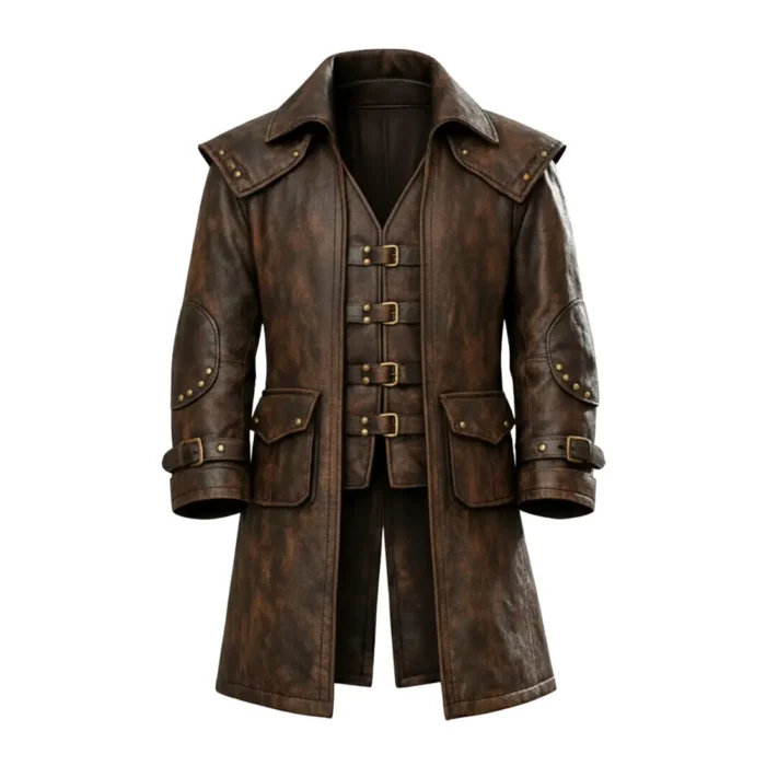 Evoke the mystery of the open road and the peril of the high seas with our Distressed Leather Pirate Coat, a garment forged for the modern-day rogue. This heavy-duty trench is meticulously handcrafted from top-quality cowhide leather, featuring a deeply weathered finish that provides an authentic, “lived-in” aesthetic from the very first wear. Its design pays homage to the legendary highwaymen of the 18th century, incorporating a dramatic shoulder mantle and a structured, multi-layered front that serves as both armor and statement piece. Whether you are navigating a steampunk wasteland or commanding a pirate crew, this coat offers unparalleled durability and dark, romantic flair.