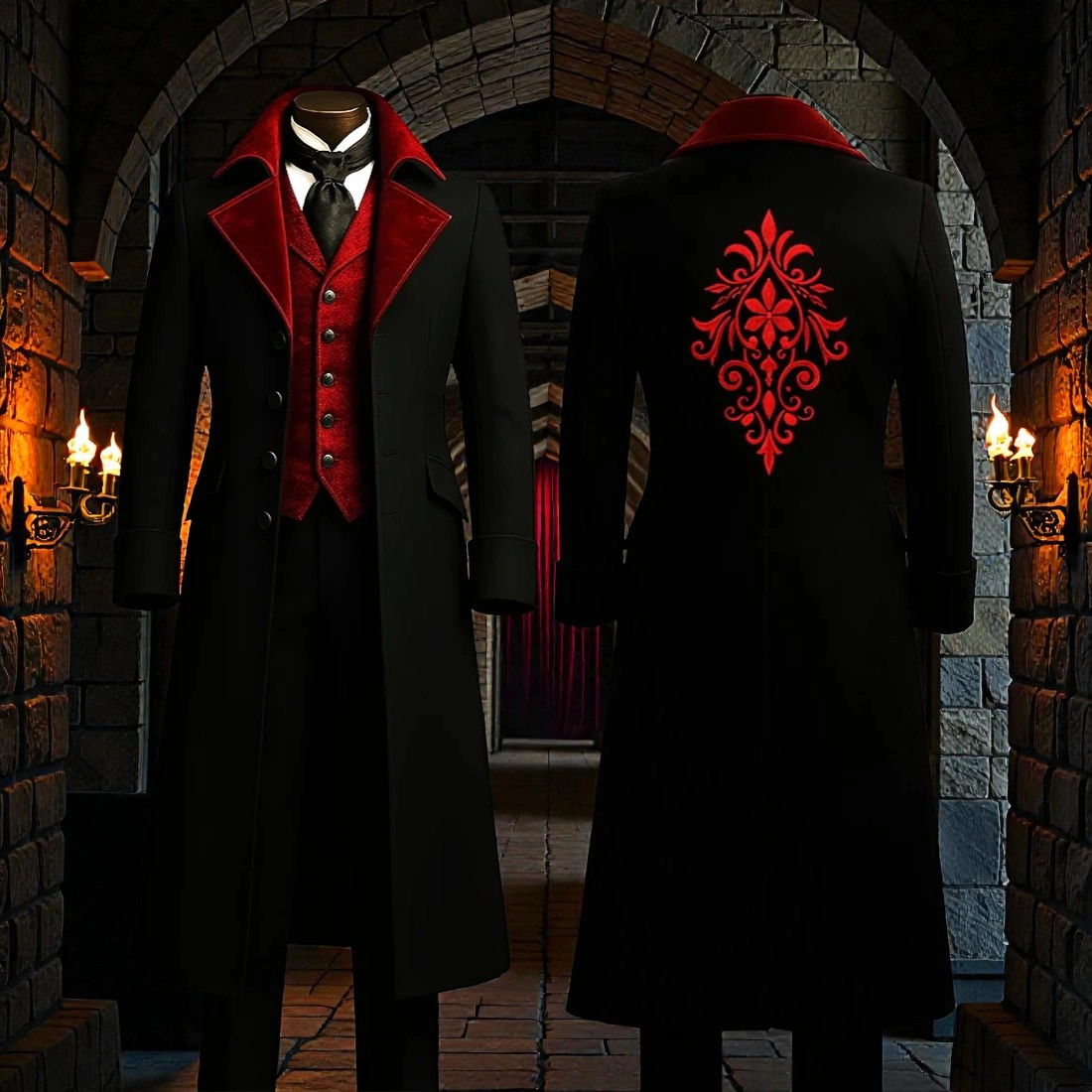 The striking blood red velvet lapels offer a vivid contrast, seamlessly leading the eye to an integrated crimson waistcoat that adds historical depth and texture. At the center of the back, a grand damask embroidery serves as a floral emblem of dark romance and eternal devotion.