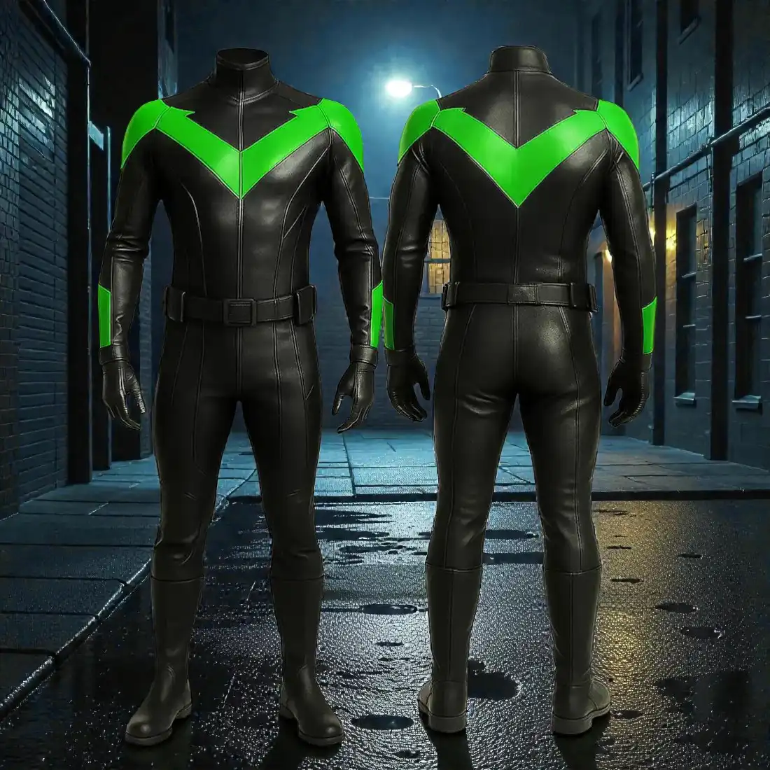 Give your character build a fresh edge with a green-themed vigilante suit that offers a rare twist on the classic look. This Green Nightwing cosplay costume blends a sleek faux leather surface with a bright green emblem that hits a balance between eye-catching and refined. This superhero suit keeps a smooth silhouette that looks polished in indoor studios and outdoor con settings. Inspired by creative reinterpretations of Dick Grayson in alternate fan and comic designs, this version stands out without drifting away from the core energy of the character.