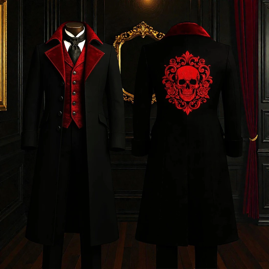 Embrace the haunting beauty of the Victorian era with our Memento Mori Gothic Coat, a garment designed for the modern aristocrat of the night. This exquisite frock coat is masterfully constructed from heavy midnight black velvet, providing a luxurious texture that perfectly anchors its dark and romantic aesthetic. The striking blood red velvet lapels provide a vivid contrast, leading the eye to the integrated crimson waistcoat that adds historical depth and a tiered silhouette.