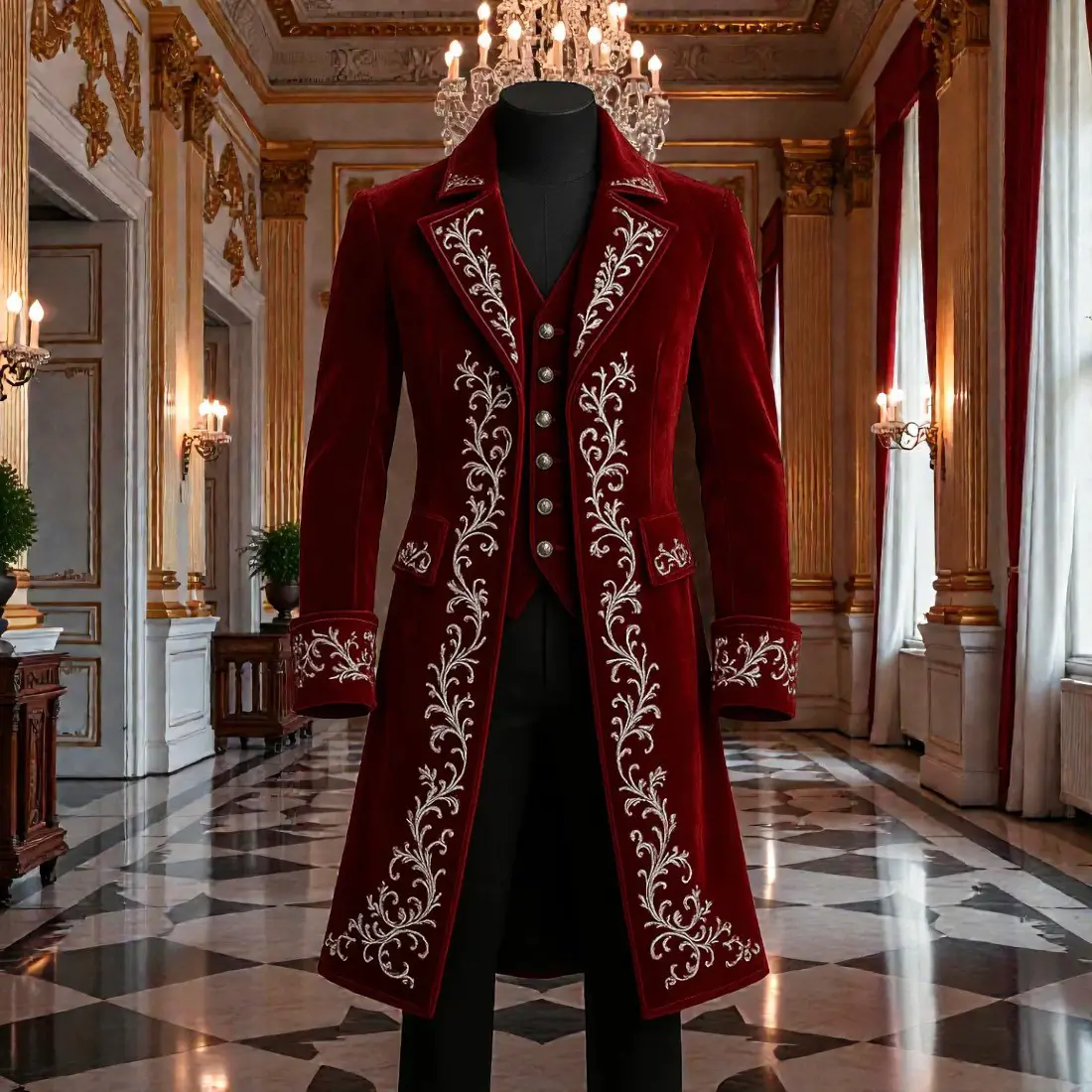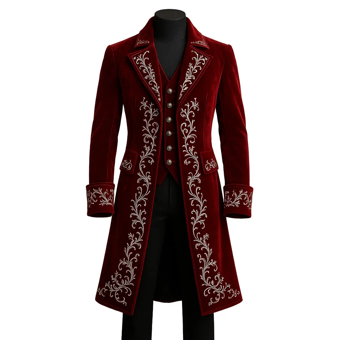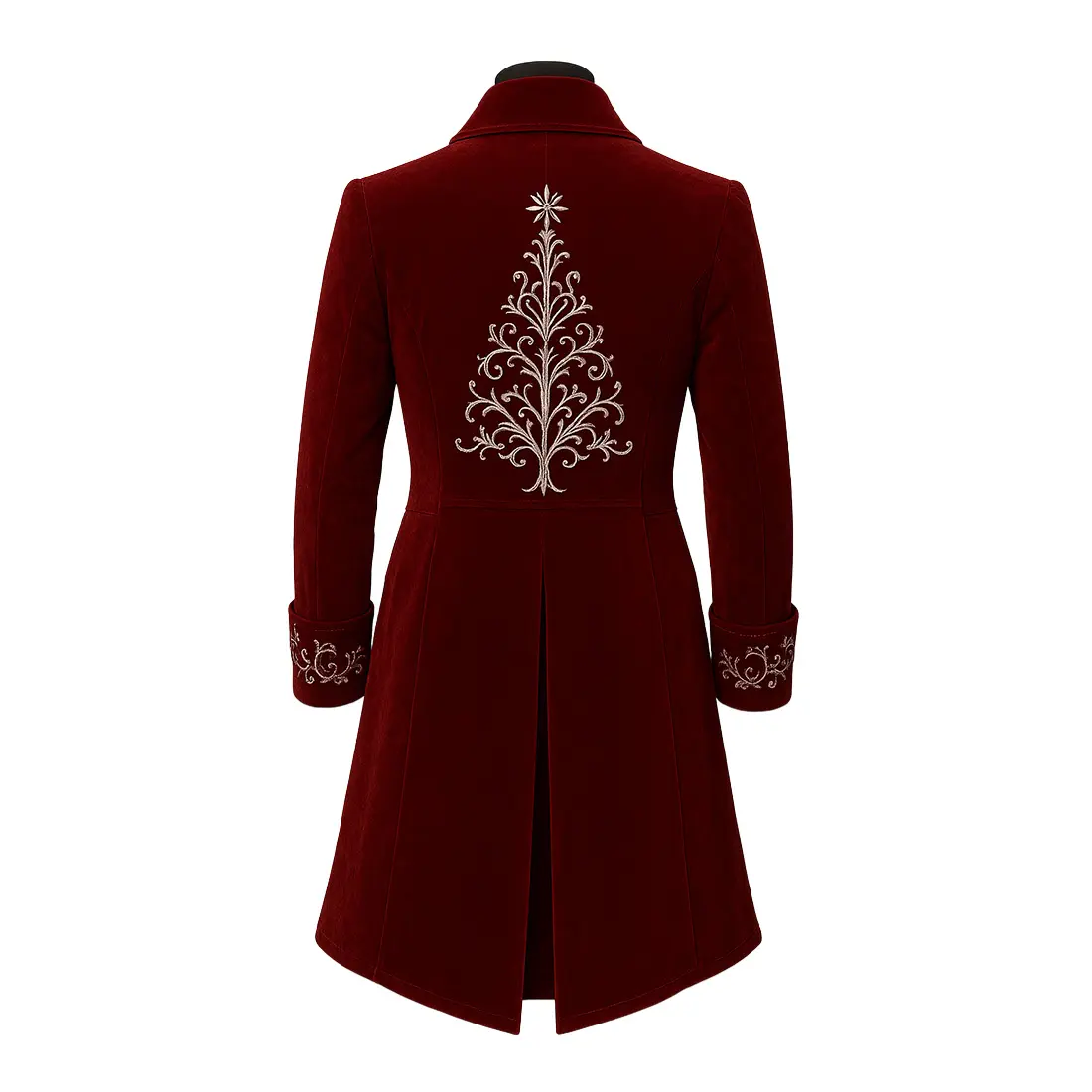 Exude sophisticated holiday charm with this Men’s Christmas Formal Coat, a luxurious long jacket designed for high-end winter vacations and festive celebrations. Tailored from premium, deep-red velvet, this exquisite tailcoat features elaborate silver filigree embroidery that flows along the front panels and cuffs. The back is anchored by a stunning, meticulously stitched Christmas tree motif, making it a standout piece for any seasonal event.