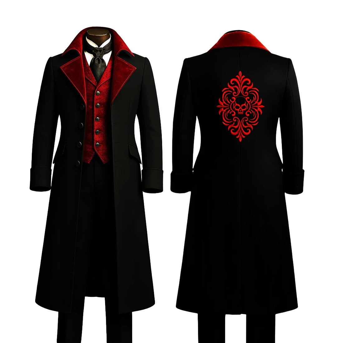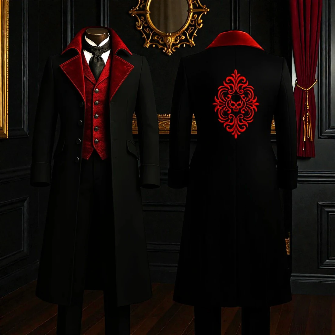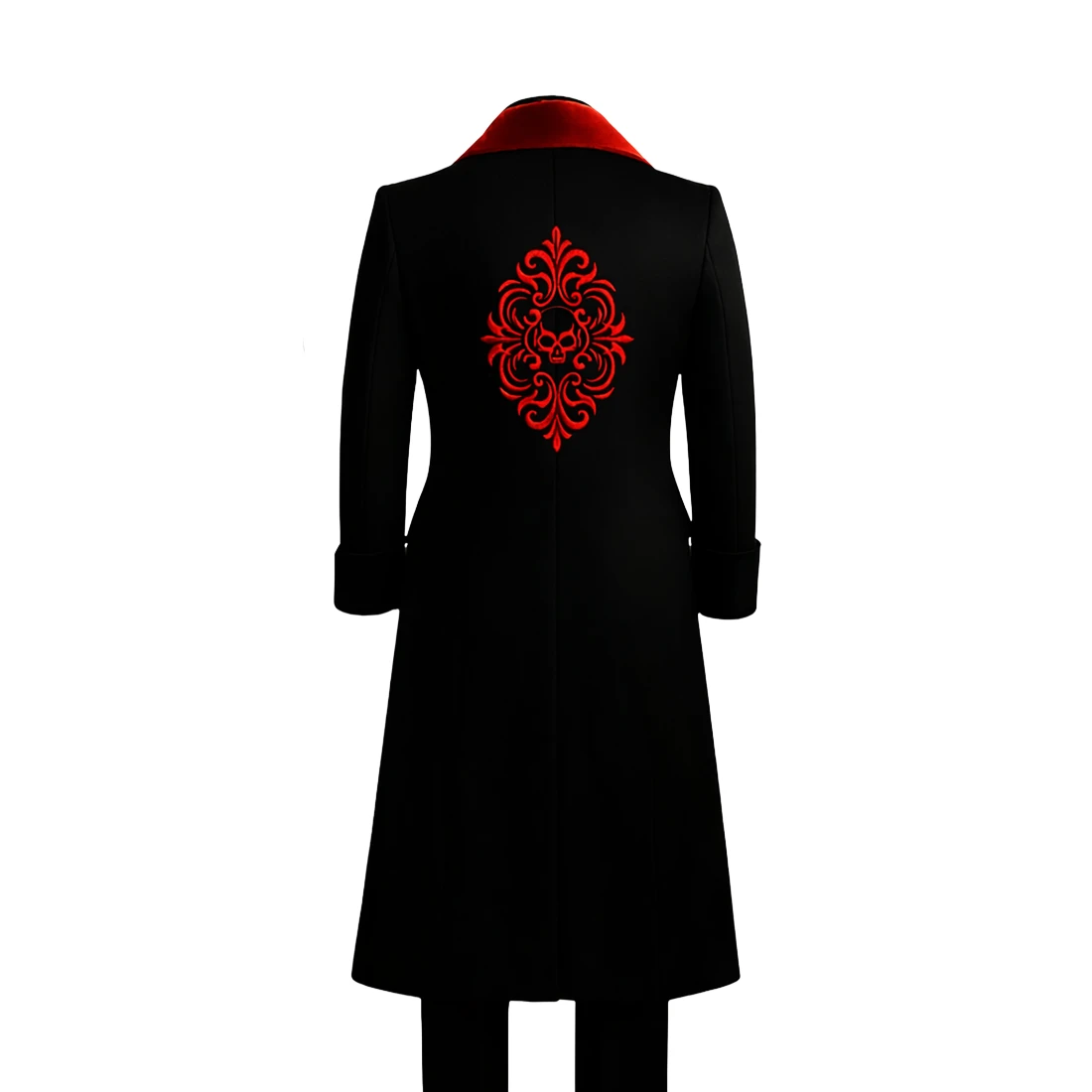 Embrace a silhouette of formidable elegance with our Gothic Damask Skull Embroidered Coat, a garment crafted for the modern aristocrat of the night. This sophisticated long line overcoat is forged from a deep black fabric that absorbs light and commands a powerful presence in any room. The sharp red lapels provide a vivid contrast, drawing the eye toward the integrated crimson waistcoat that lends a layered and historical depth to the ensemble.