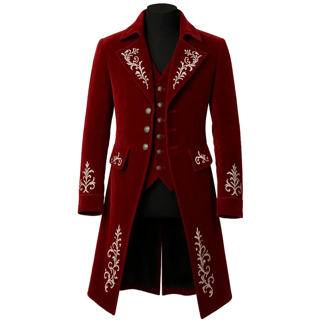 Men’s Red Winter Vacation Outfit | Embroidered Christmas Tailcoat | Velvet Holiday Party Coat | Festive Seasonal Formal Wear
