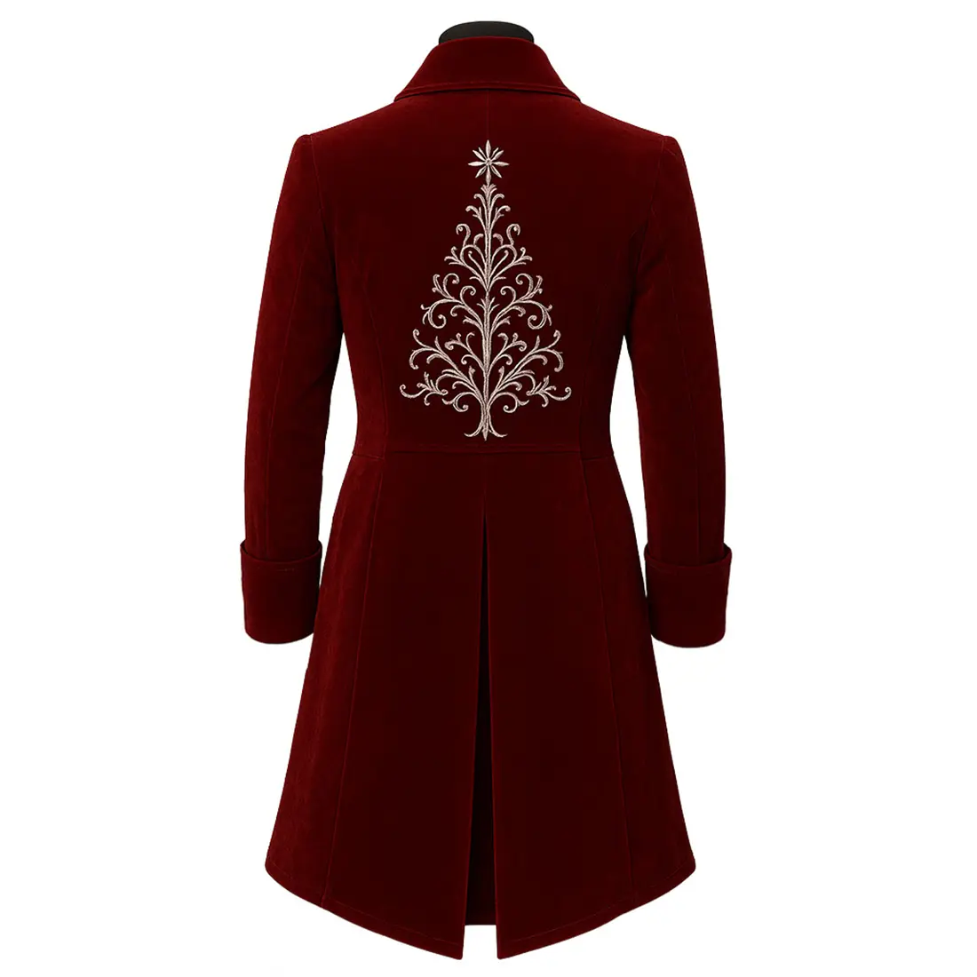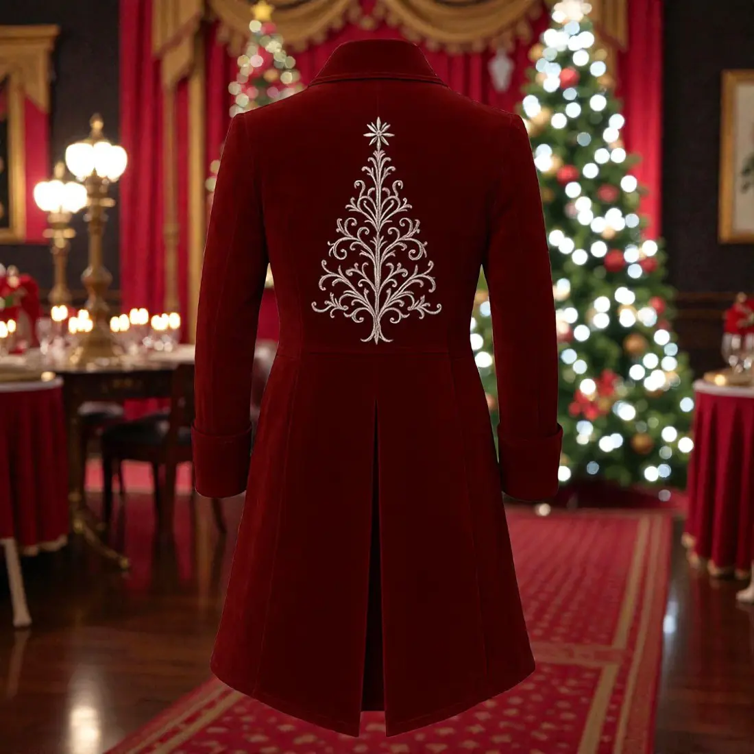 The centerpiece is a magnificent, stylized Christmas tree embroidered on the back, crowned with a silver star to capture the true spirit of the holidays. Whether you are hosting a formal winter gala or portraying a festive character, this structured velvet coat provides a sophisticated, classic silhouette that stands out in any setting.