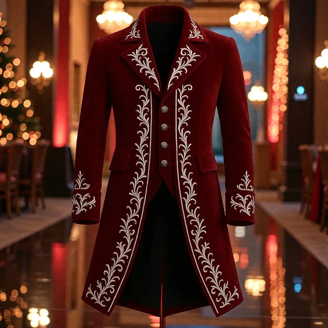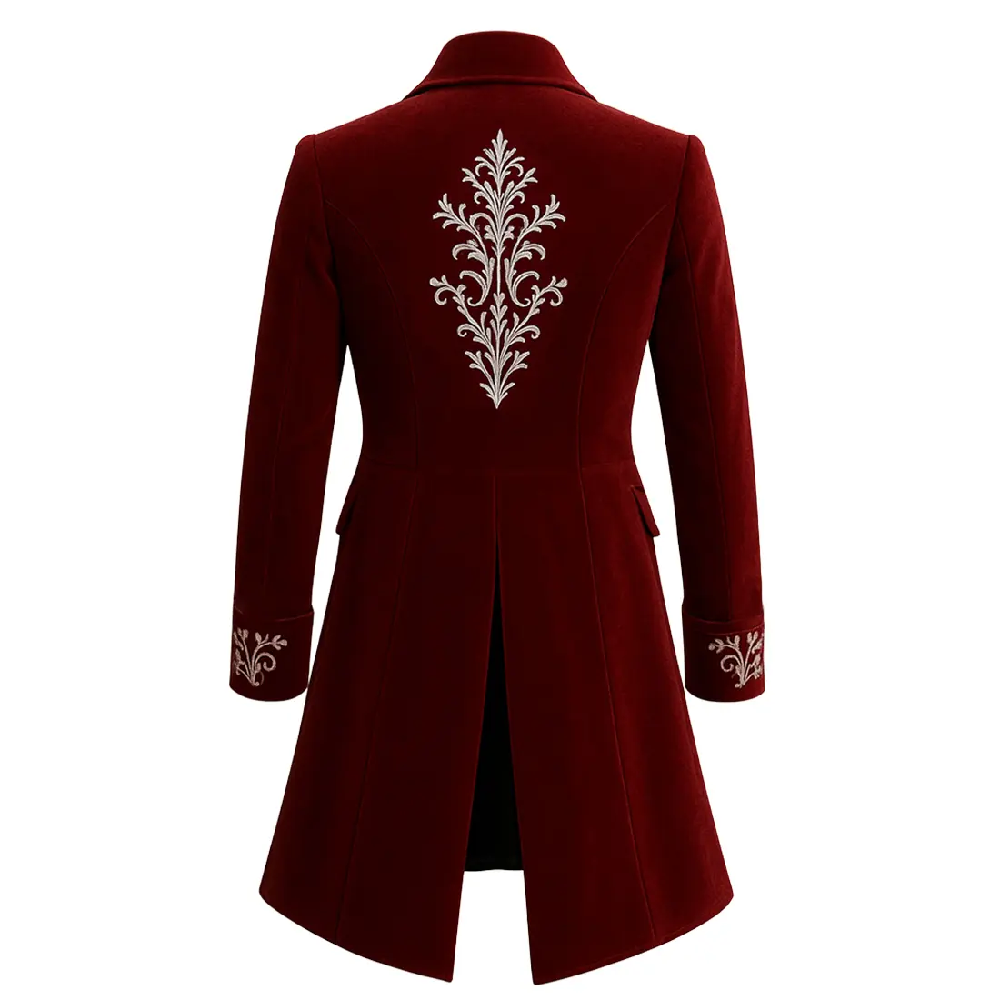 Make a majestic entrance on your special day with this Men’s Winter Wedding Embroidered Coat, a masterclass in Victorian-inspired formal wear. Crafted from luxurious deep-crimson velvet, this tailcoat features exquisite ivory filigree embroidery that creates a striking contrast against the rich fabric. The structured silhouette is designed to provide a regal, tapered fit, making it an ideal choice for grooms, high-end holiday galas, and festive winter celebrations.