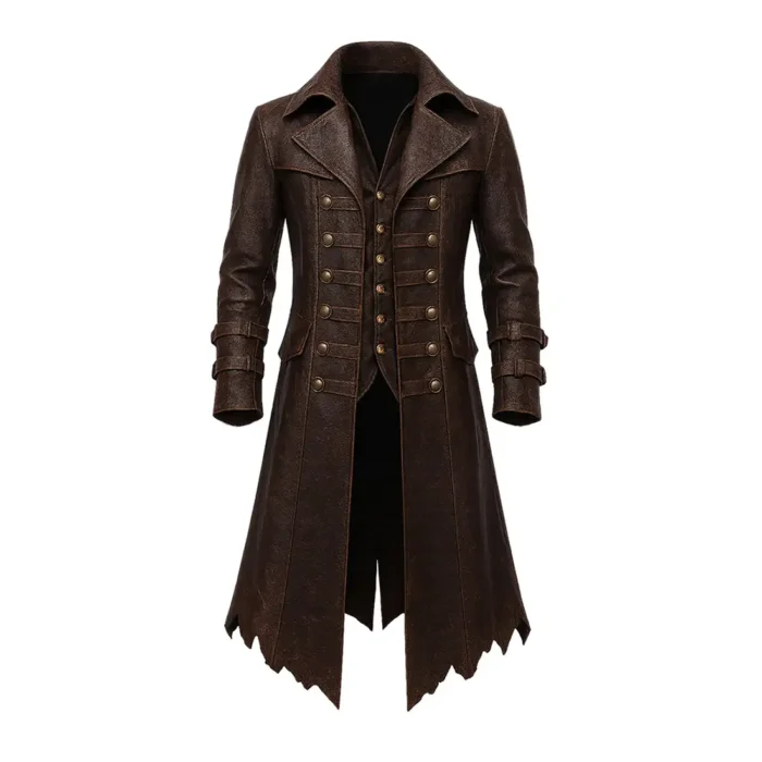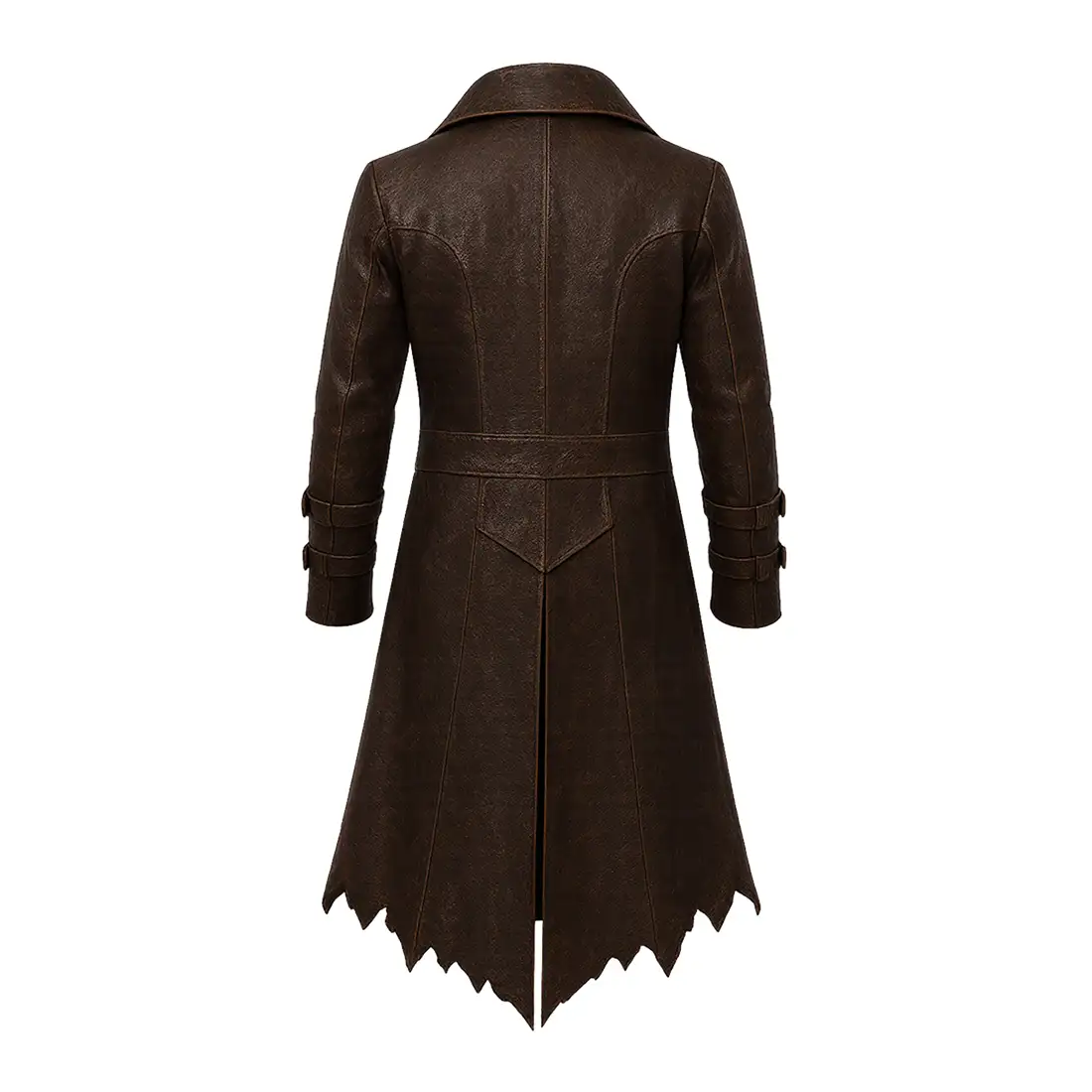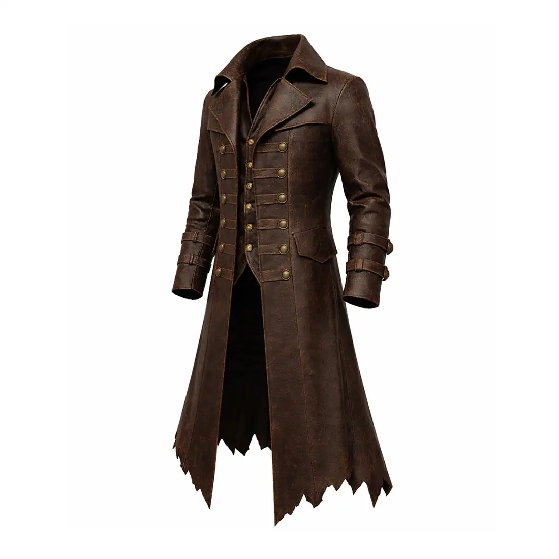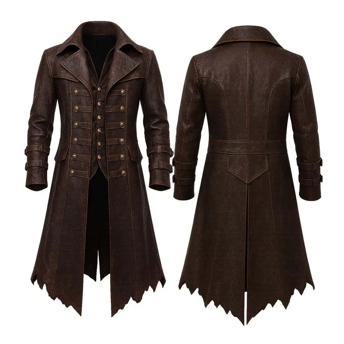 Rule the treacherous waves or the dystopian streets with our Pirate Cosplay Coat, a rugged masterpiece of gothic engineering. This trench coat is expertly constructed from premium distressed cowhide leather, featuring a weathered and aged texture that tells the story of a thousand voyages. The design features a striking double breasted front adorned with antique bronze buttons and an integrated leather waistcoat for a layered, historical silhouette. Defined by its dramatic jagged hemline and heavy buckled cuffs, this coat is the ultimate armor for captains, outlaws, and seekers of the dark aesthetic.