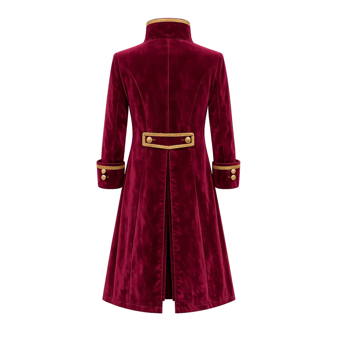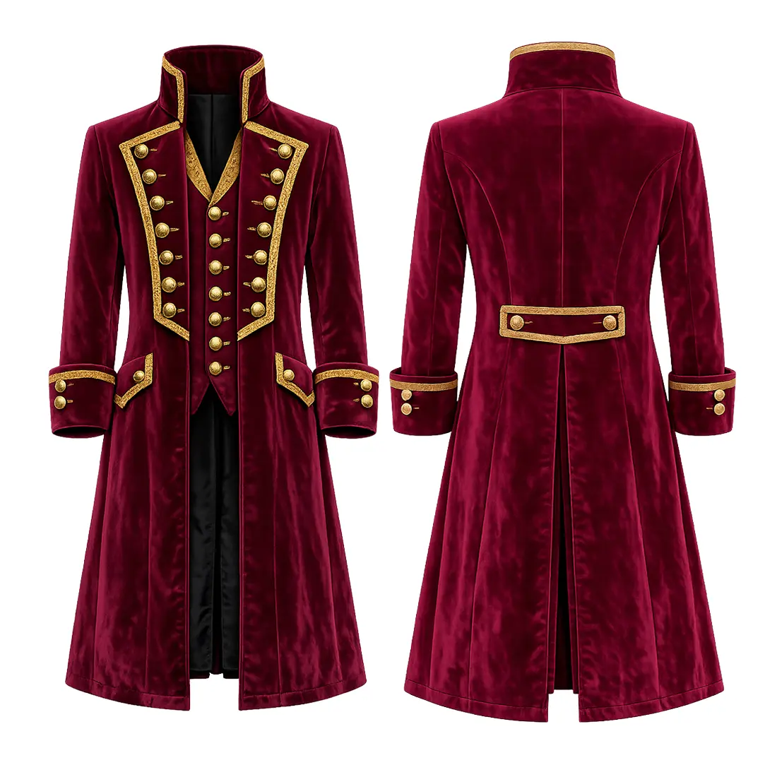 Step into the golden age of piracy with our Red Velvet Pirate Jacket, a garment that combines the opulence of the royal courts with the bold spirit of the high seas. Tailored from top-quality crimson velvet, this frock coat offers a lush, light-catching texture that demands attention at any gathering. The design is characterized by its brilliant gold braided trim that borders the high stand-up collar, the wide lapels, and the pockets, creating a prestigious look fit for a fleet commander. Featuring an integrated waistcoat and a traditional long-line silhouette, this jacket is the definitive choice for those who wish to lead their crew with unmatched style.