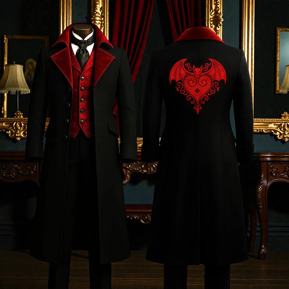 On the back, an exquisite filigree heart with ornate bat wings is embroidered in brilliant red silk thread, symbolizing the intersection of love and the macabre. Whether you are stepping into a formal gothic gala or a high stakes masquerade, this frock coat ensures you possess the most commanding silhouette in the room.