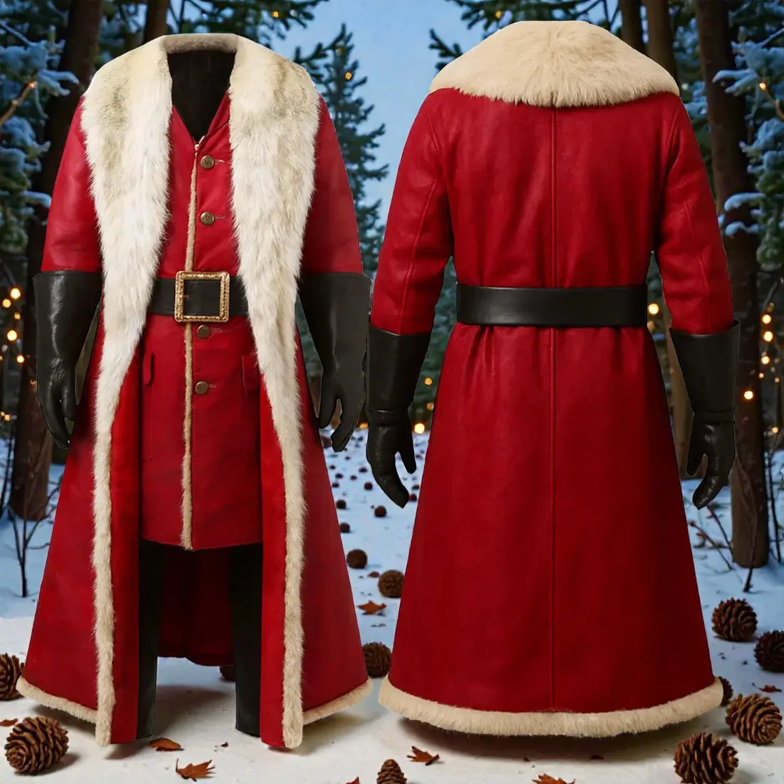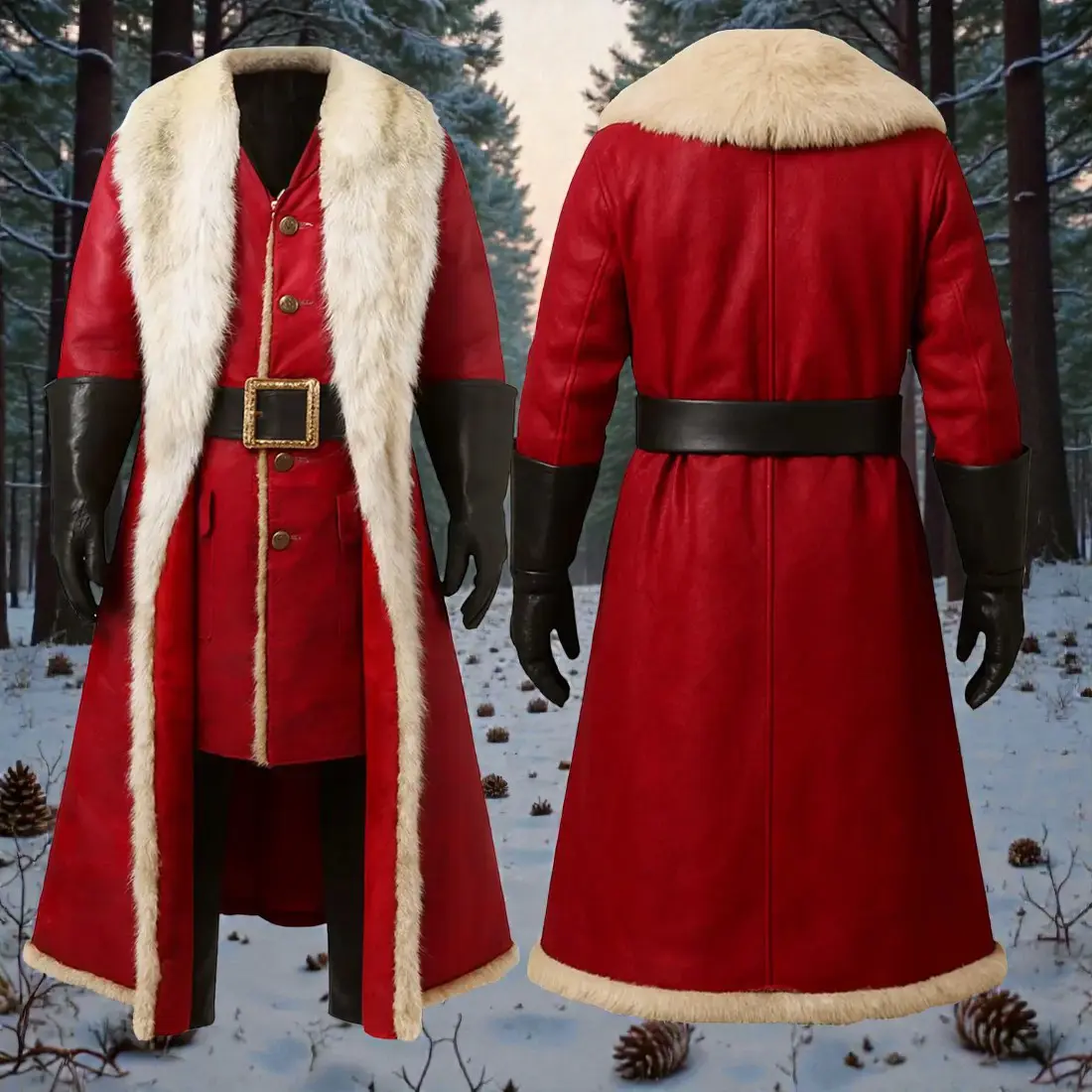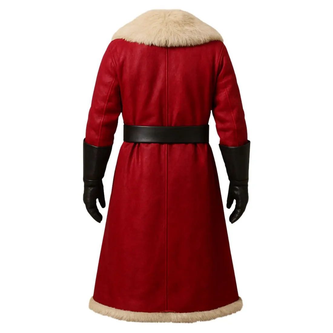 Santa Cosplay Costume | Red Leather Christmas Fur Long Coat | Father Christmas Leather Outfit | Men’s Winter Vacation Coat