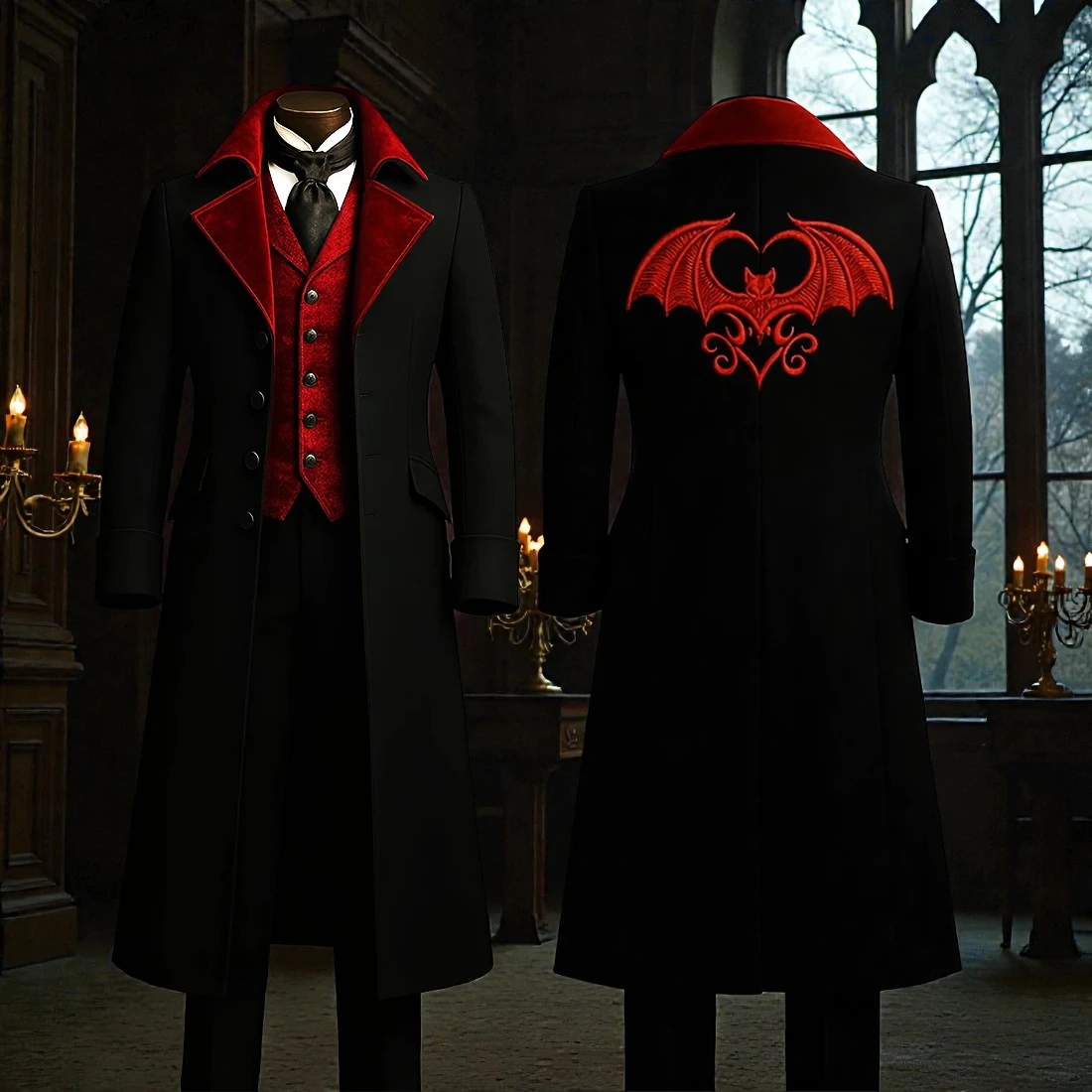 The coat features striking blood-red lapels that create a bold, high-contrast aesthetic against the dark body, while the integrated crimson waistcoat adds historical depth and texture. The crowning jewel of this ensemble is the ornate bat wing heart embroidery on the back, a symbol of nocturnal romance and dark regency that makes this overcoat a definitive piece of alternative formal wear.